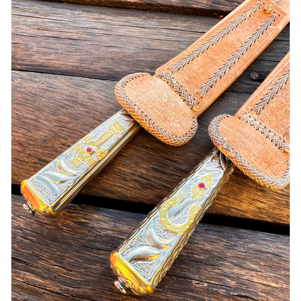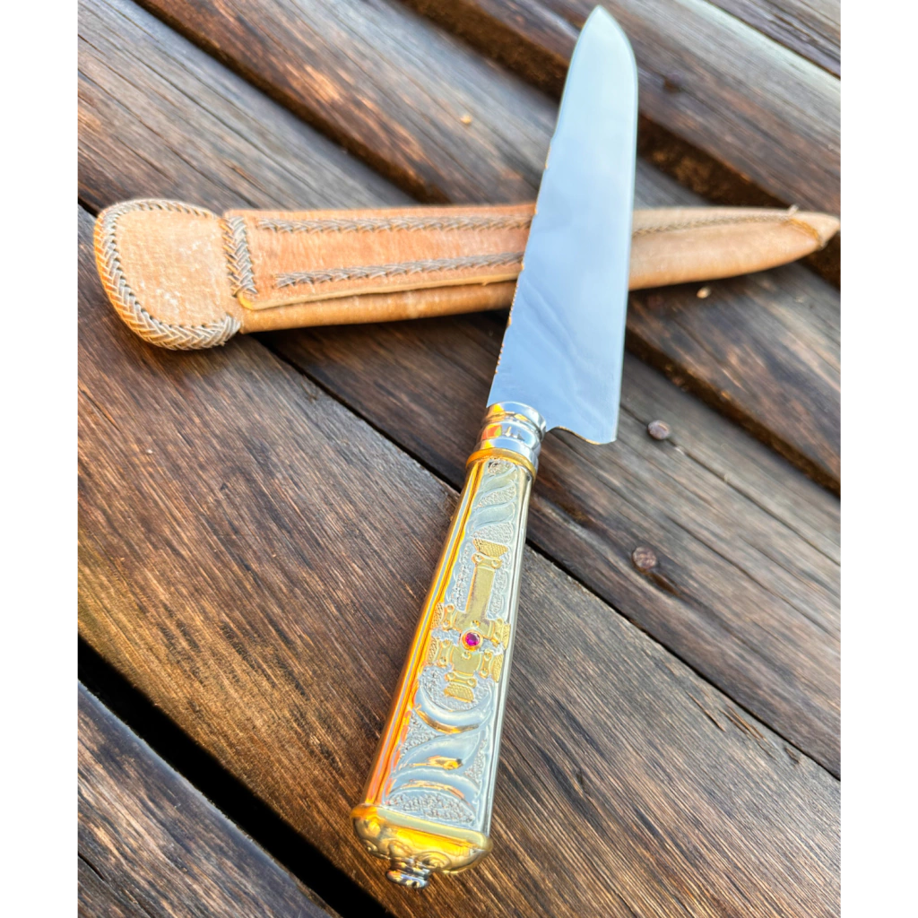 Desperte o seu lado mais refinado com esta faca de alta qualidade, onde cada detalhe foi cuidadosamente pensado. O luxuoso cabo de alpaca, com seus detalhes folheados em ouro, traz um brilho único e um toque de sofisticação incomparável.