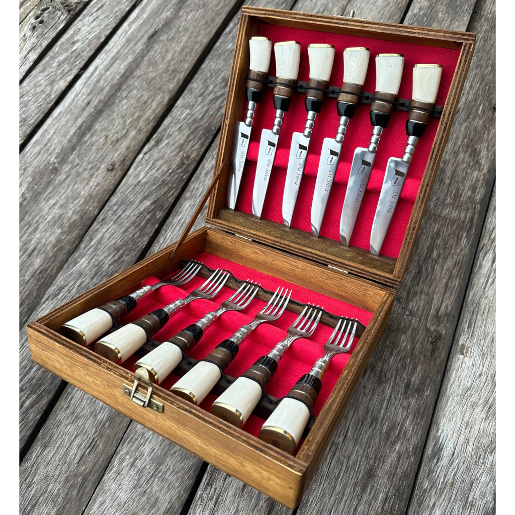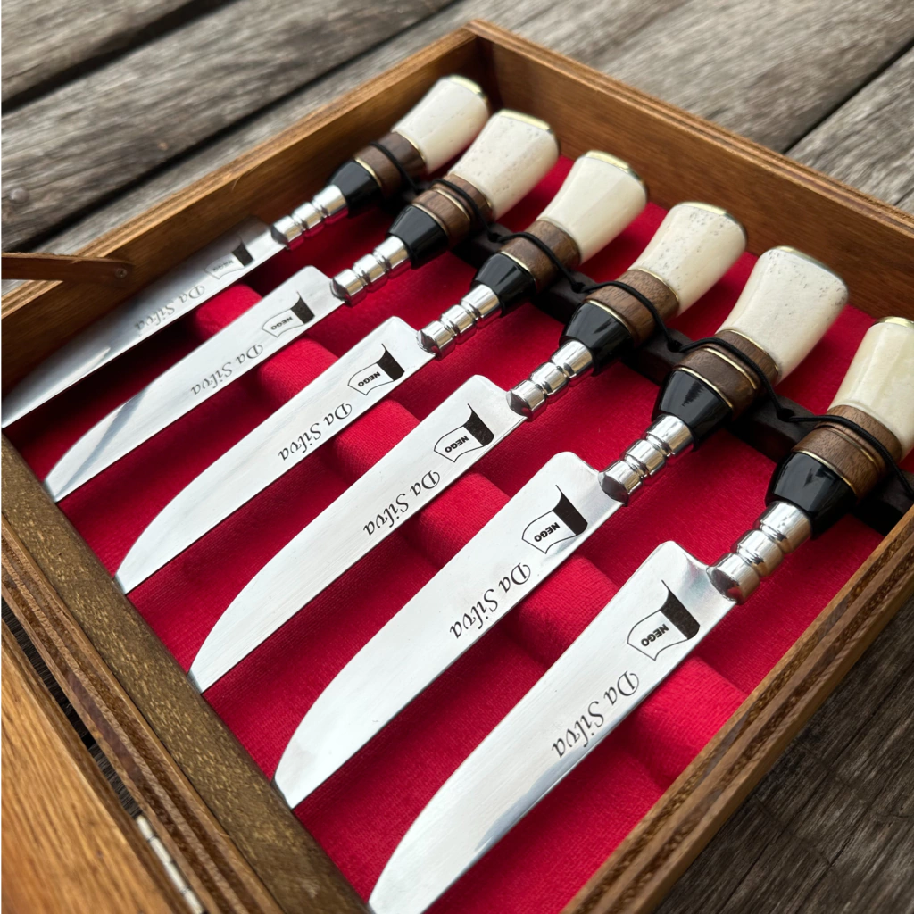 Com facas e garfos de alta precisão, acabamento artesanal e uma caixa de madeira estilizada com forro vermelho, este conjunto entrega presença, tradição e qualidade em cada peça.